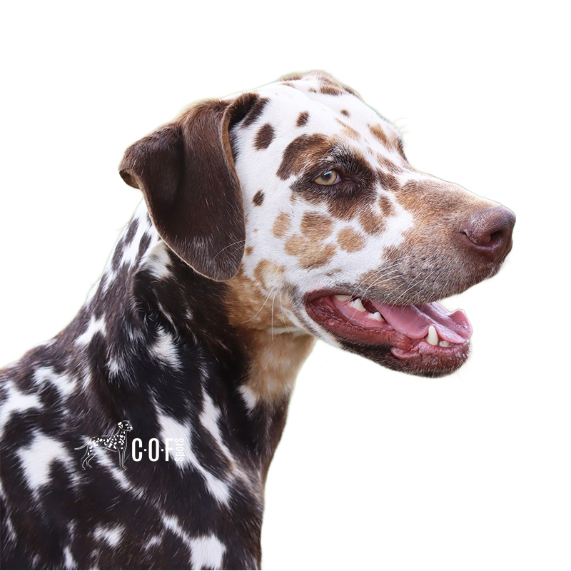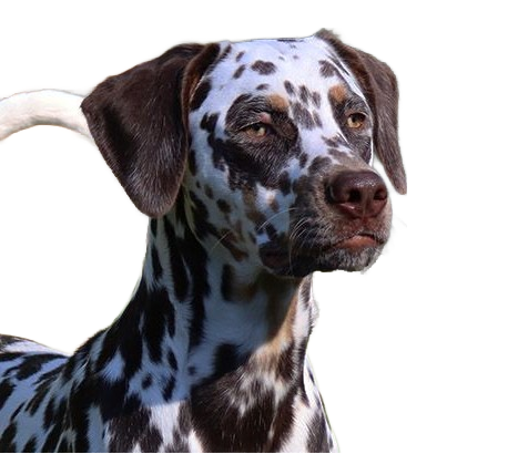 „Das Hauptmerkmal diese Rasse ist die Zeichnung. Die Grundfarbe des Hundes ist weiß, und der Kopf, die Ohren, der Körper, die Rute und die Läufe haben kleine schwarze oder leberfarbige Flecken, die ungefähr 2-3 Zentimeter im Durchmesser haben.“