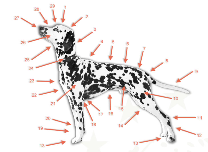 Je mehr Muskulatur umso weniger ist und bleibt er ein ausdauernder Laufhund. Aber nicht nur die Ausdauer ist es die diese Rasse für viele Menschen ansprechend macht sondern auch seine Größe und das Gewicht. Ein leichter und zarter Dalmatiner ist für den Menschen viel besser zu halten. Es ist schon ein Unterschied ob sie mit 25 oder 35 kg Hund spazieren gehen, besonders dann wenn er sich mal richtig in die Leine legt. Der DDV e.V. richtet sich nach dem FCI Rassestandard jedoch mit einigen wenigen Abweichungen: