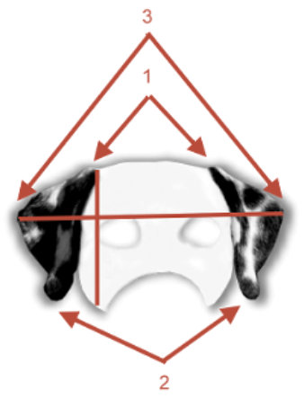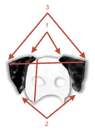 2. links Ohrenspitze abschließend mit Wangenknochen, Ohrenform zeigt gleichschenkliges Dreieck